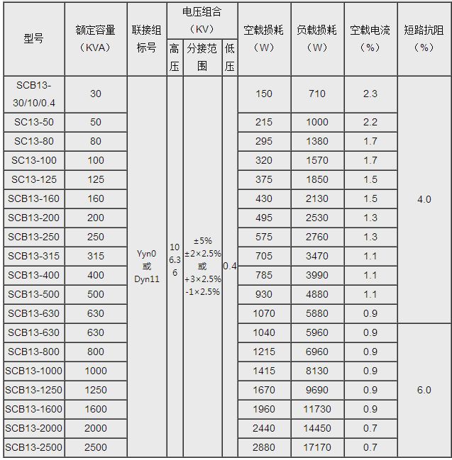 SCB13干式變壓器技術參數表: